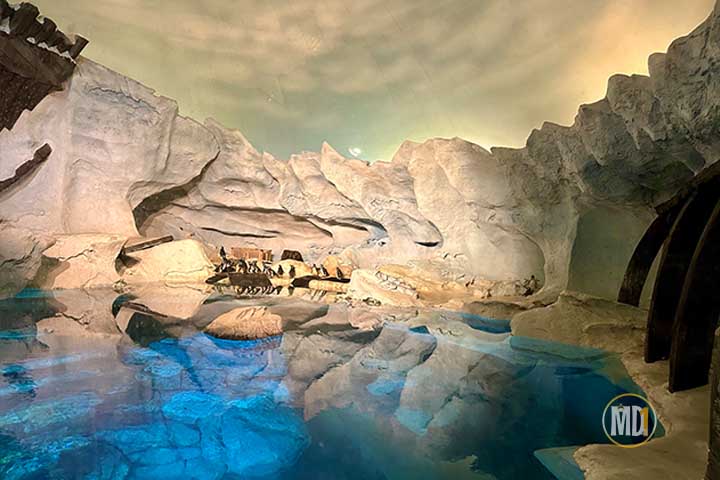 A saída da atração cai em um lindo ambiente onde poderemos ver as belugas, morsas, pinguins e outros animais marinhos. Pudemos ver de pertinho o trabalho do local onde as belugas ficarão, e toda água que foi drenada pela primeira vez desde que o parque foi inaugurado. Incrível né?!